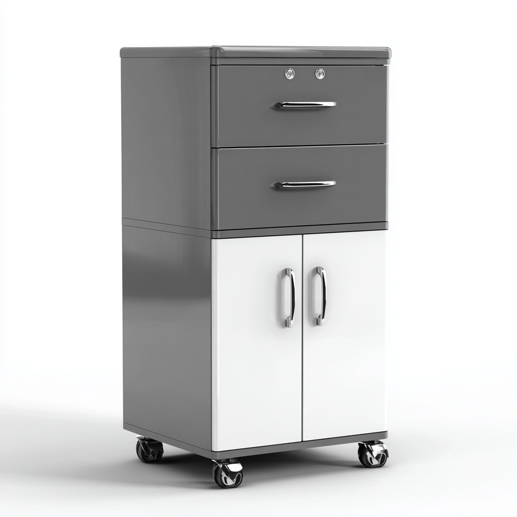 Configurazione con elementi di apertura frontale e vani chiusi che permettono una gestione ordinata degli utensili e degli accessori da cucina. La base mobile favorisce una disposizione flessibile nello spazio.