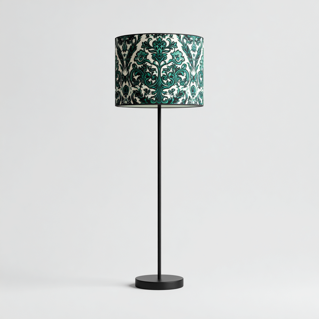 La base e l'asta sono realizzate in metallo verniciato nero. Il paralume in tessuto decorativo presenta motivi in verde e crema, offrendo un tocco estetico distintivo.