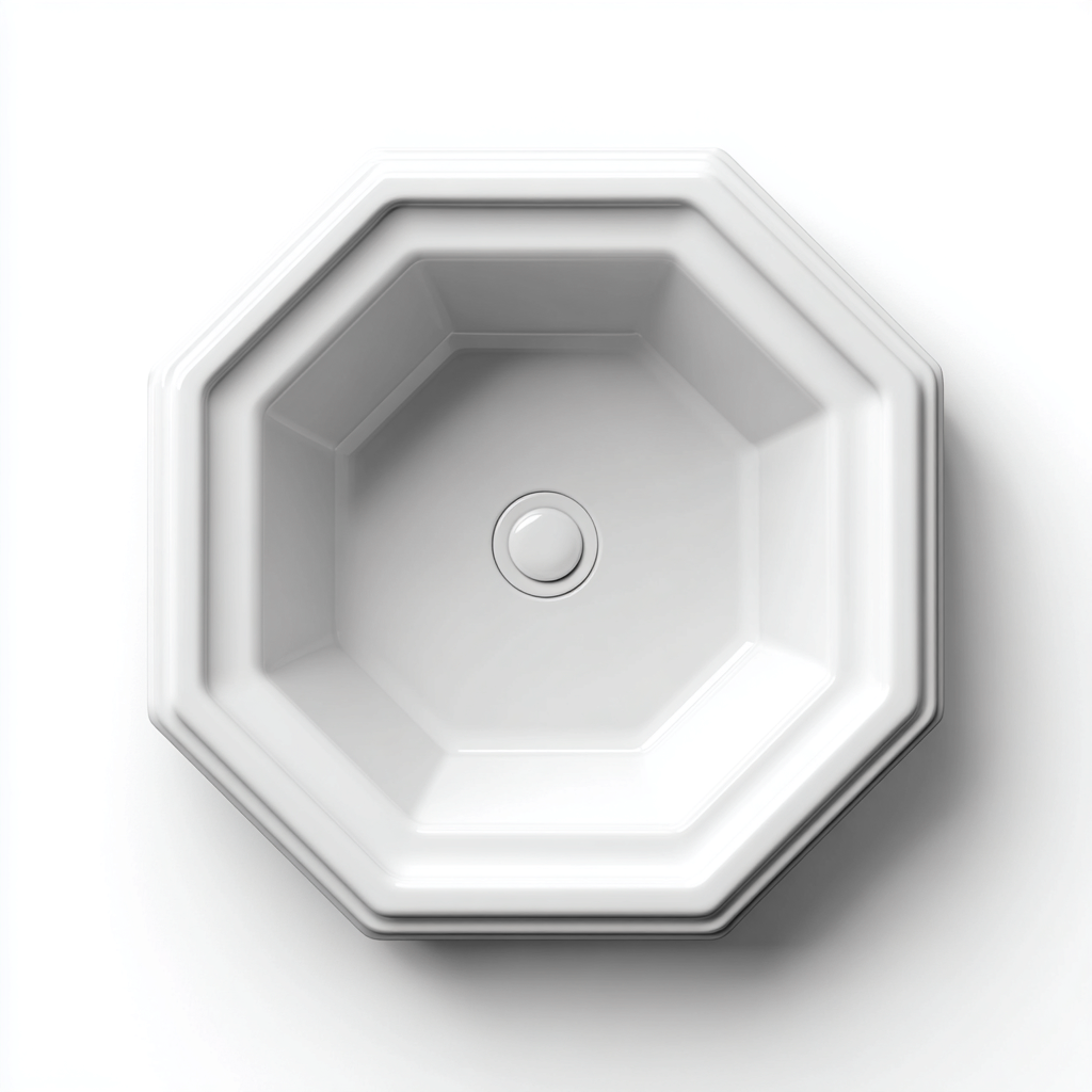 Lavabo da bagno di forma ottagonale caratterizzato da una struttura geometrica equilibrata e superfici ben definite. Il design moderno e simmetrico conferisce un aspetto ordinato e contemporaneo rendendolo adatto a bagni dal gusto architettonico e minimale.