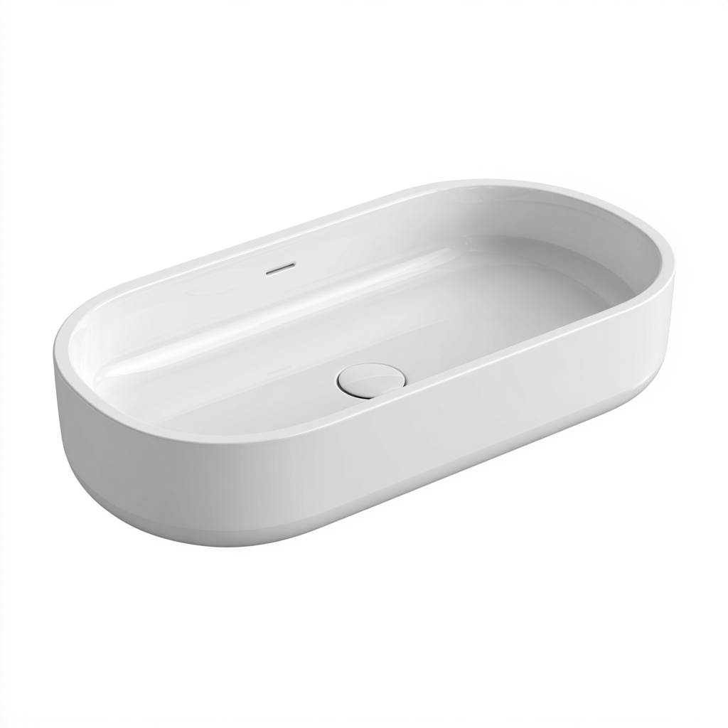Lavabo da bagno di forma ovale allungata caratterizzato da linee morbide e proporzioni slanciate. Il design elegante e contemporaneo lo rende ideale per bagni moderni dove funzionalita ed estetica si integrano in modo armonioso.