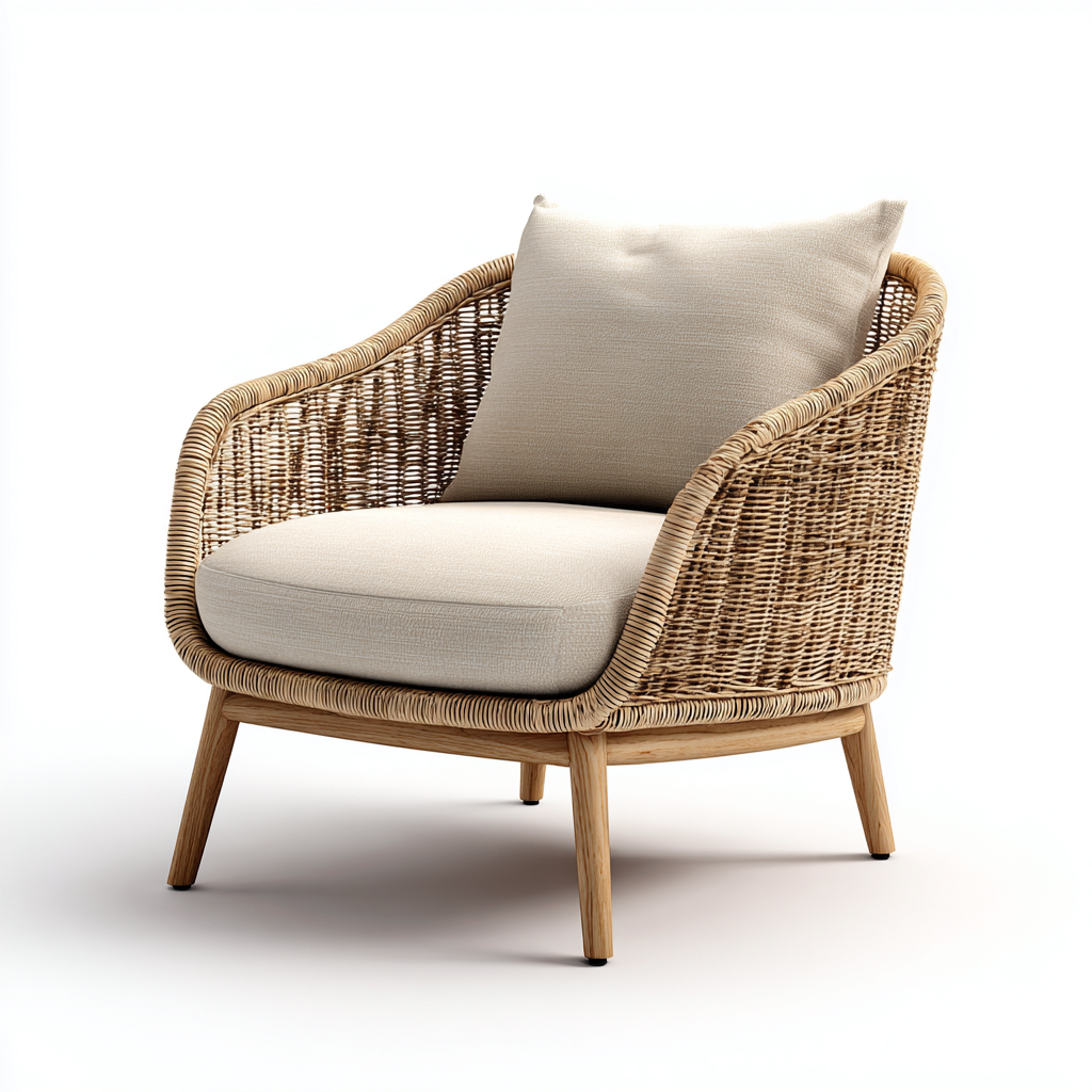 La struttura è realizzata in legno naturale, lavorato per garantire stabilità e solidità. Lo schienale e i lati sono rifiniti con rattan intrecciato di colore naturale, mentre la seduta è dotata di cuscino in tessuto beige, adatto all'utilizzo in ambienti esterni.