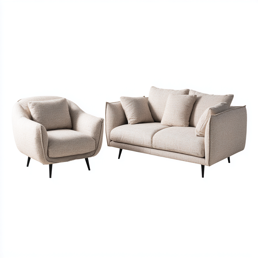 Questo set divani è composto da un divano a due posti e una poltrona coordinata, progettati per arredare il soggiorno con uno stile moderno e luminoso. Le linee morbide favoriscono un utilizzo confortevole nella vita quotidiana.