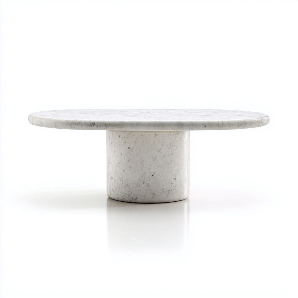Il piano e la base centrale sono realizzati in marmo con finitura di colore bianco, caratterizzata da una superficie liscia e da venature naturali che rendono ogni pezzo unico.