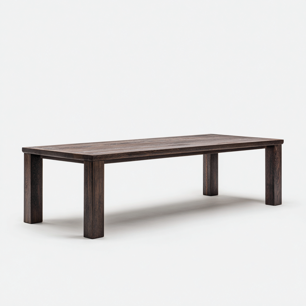 Il tavolo è realizzato interamente in legno di colore marrone scuro con venature naturali ben visibili. Il piano e le gambe a sezione piena sono rifiniti con cura per garantire solidità strutturale, stabilità e una superficie resistente all'uso quotidiano.