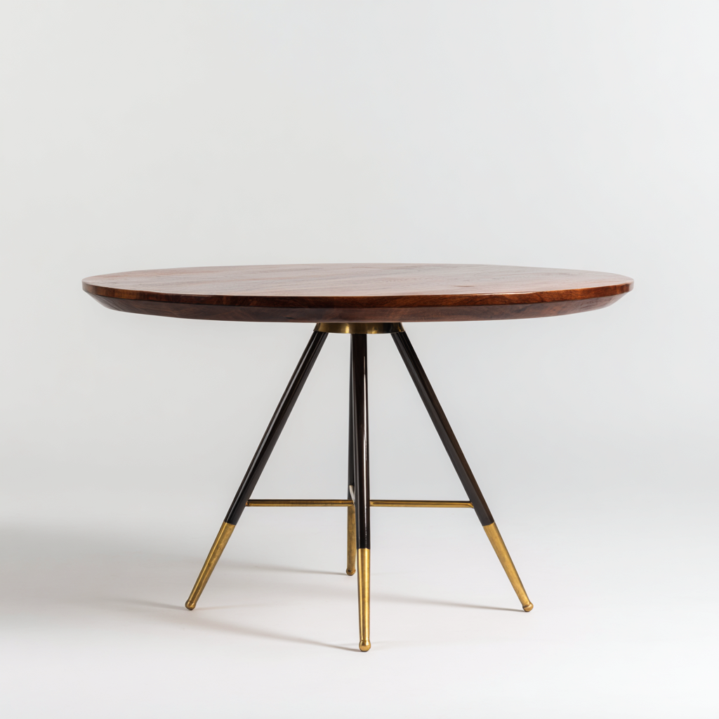 Il piano è realizzato in legno di colore marrone con venature naturali ben visibili. La struttura di supporto è composta da elementi in metallo con finitura scura e dettagli in tonalità oro, progettati per garantire stabilità e una resa estetica raffinata.