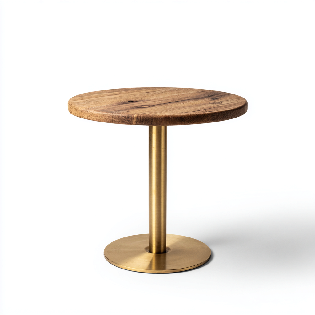 Il piano è realizzato in legno di colore marrone con venature naturali ben visibili. La base centrale è in metallo con finitura color oro, lavorata con precisione per garantire stabilità strutturale e una resa estetica raffinata.