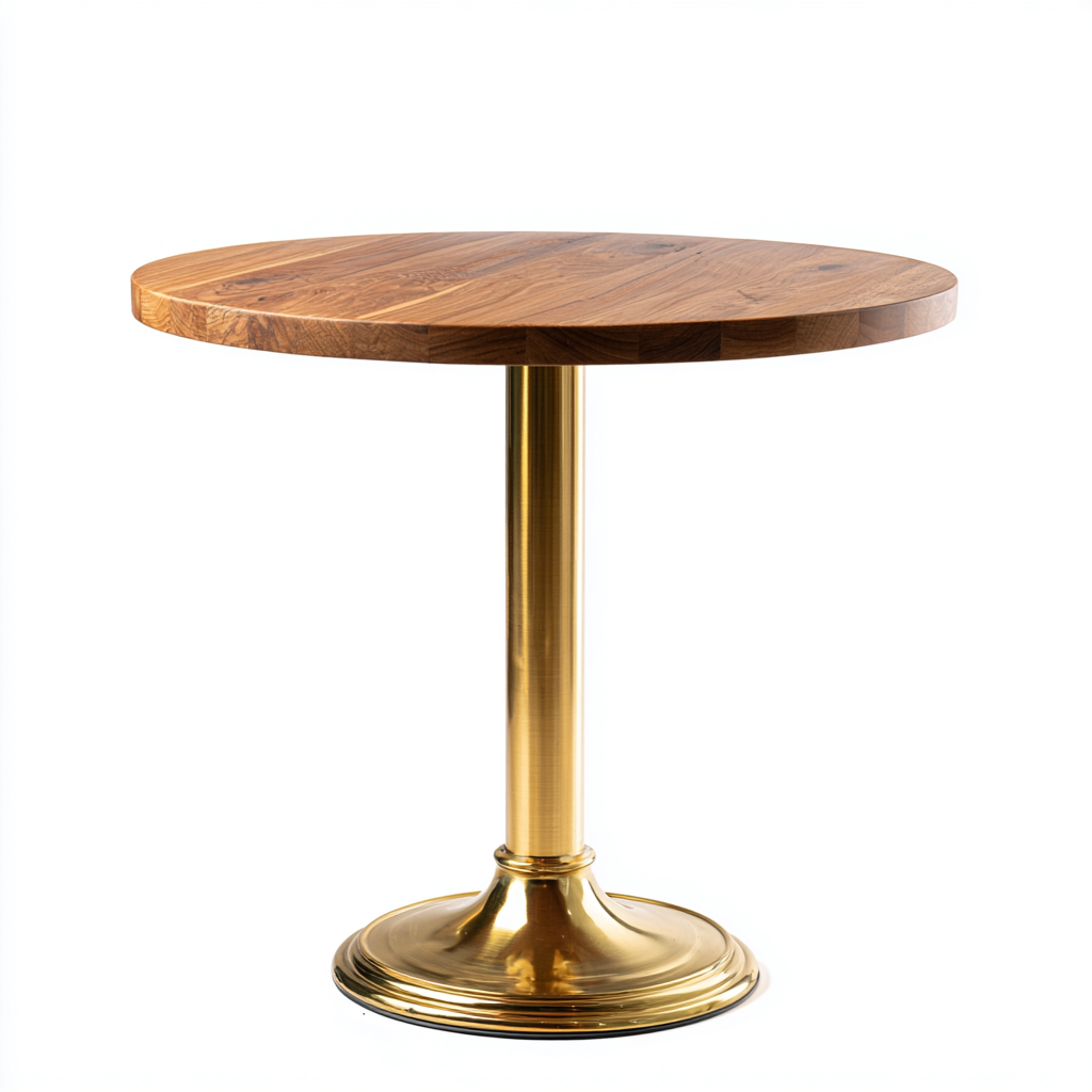 Il piano è realizzato in legno di colore marrone con venature naturali ben visibili e finitura liscia. La base centrale è in metallo con finitura color oro, lavorata con precisione per garantire stabilità strutturale e una resa estetica raffinata.
