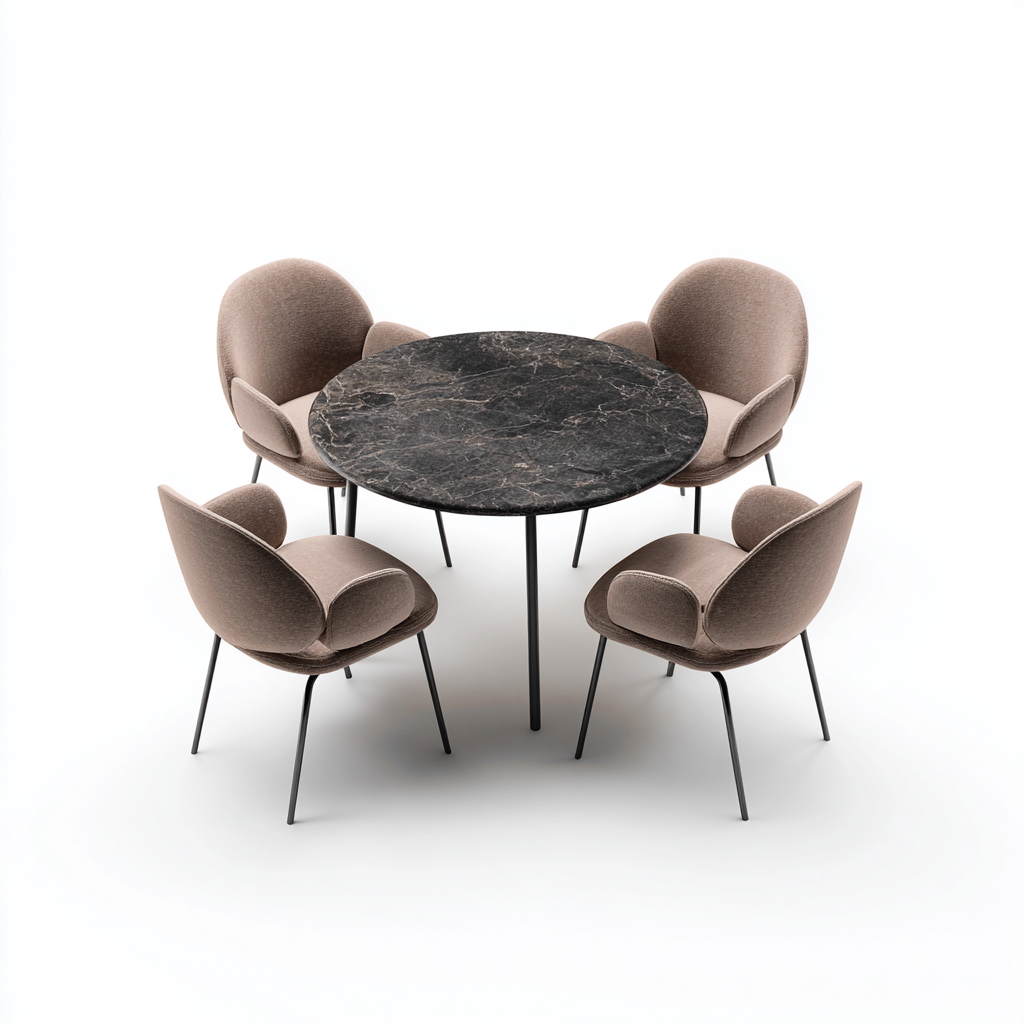 Questo set da pranzo dal design contemporaneo combina un tavolo rotondo con piano in marmo scuro e quattro sedie imbottite rivestite in tessuto, offrendo una soluzione elegante e funzionale per la sala da pranzo moderna.