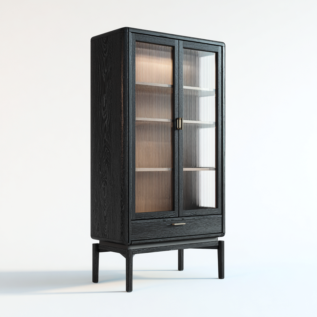 Struttura realizzata in legno con ante dotate di pannelli in vetro lavorato. La finitura uniforme e la costruzione accurata garantiscono stabilità e durata nel tempo.